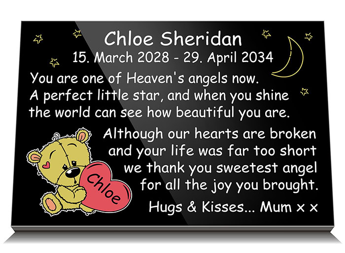 To change the short poem displayed, simply enter your preferred memorial poem for child or your personal words in the area provided above. Similarly, your daughter’s name along with dates can also be added if needed. Once you have entered your wording and photograph (if needed) a proof showing your personalisation will be sent to you for your confirmation.