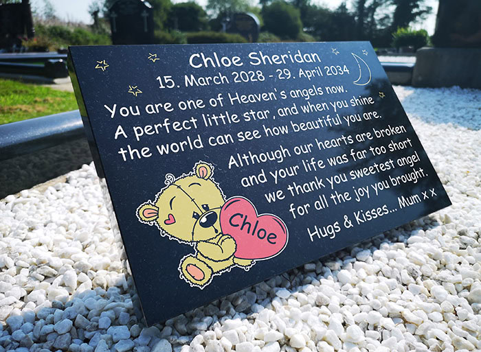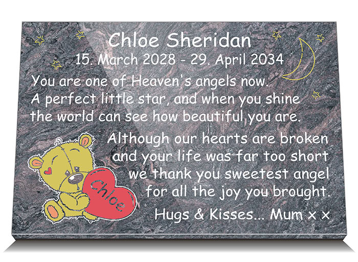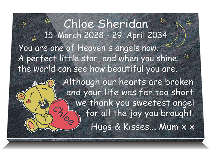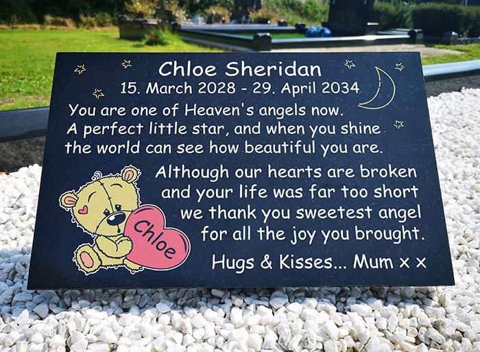 Our daughter grave ornaments come in three sizes and three granite colours. Hand-made from granite each baby memorial plaque is weather-resistant and specially made for outdoor use.