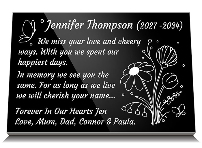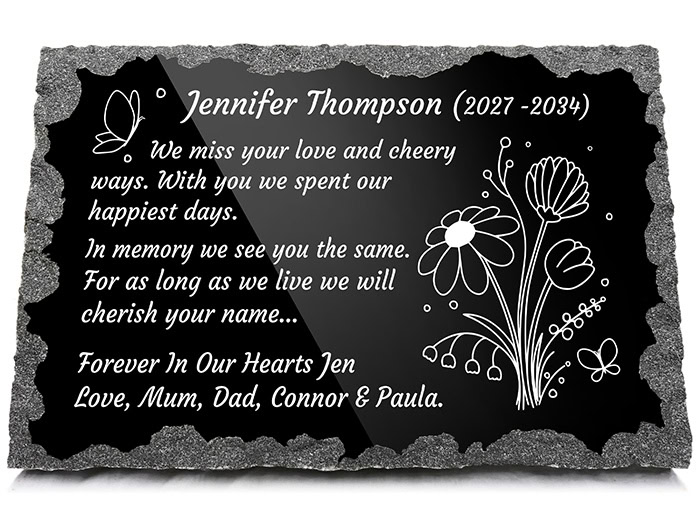 While selecting your preferred design and size you can then enter a personal inscription. We highly recommend adding your loved one’s name with the relevant dates. It’s important to realize that the memorial verse shown on this product can also be changed if needed. View our memorial poems for children for other memorial poem suggestions. Then, after deciding on the memorial plaque wording, enter your inscription in the area provided. Similarly, if you have a specific image you would like engraved please upload it also. Afterward, a proof of your plaque will be sent for your confirmation.