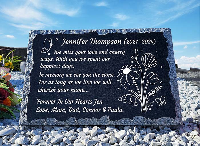 Our polished plaques have all four sides and the front with a highly polished finish. As a result, polished granite memorials need very little upkeep. In fact, all that’s needed to maintain them is a quick wipe with a damp cloth once or twice each year. Additionally, this grave plaque has a stand secured it to the back allowing rainwater to run off its surface. Thus prolonging the lifespan of the paint on the laser-engraved inscriptions and images.